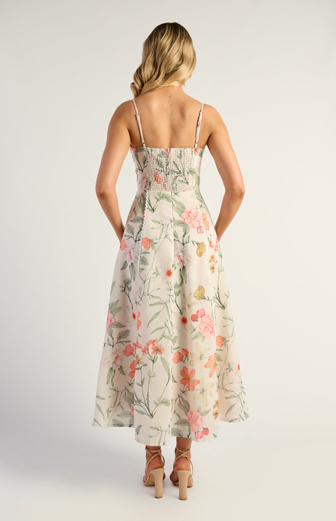 Botanica Floral Faux Linen Bust Detail Midi Dress - Apricot